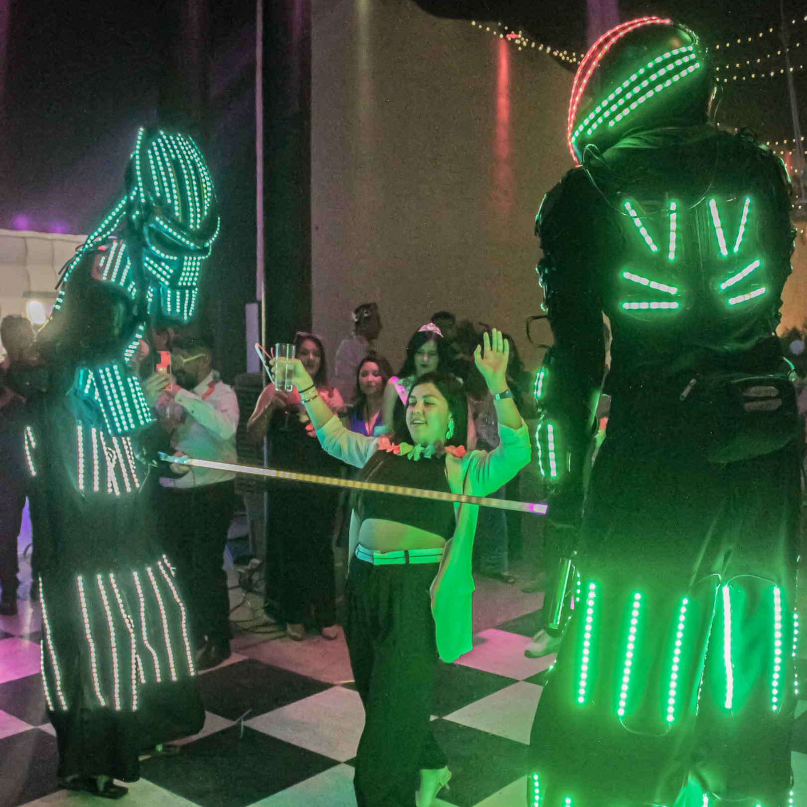 Amplificación - Iluminación - Robot leds - Cámara 360 - Totem fotográfico - Bandas música en vivo - Animador fiesta - Maquillaje fluor - Batucada brasileña - Personajes de película - Circo